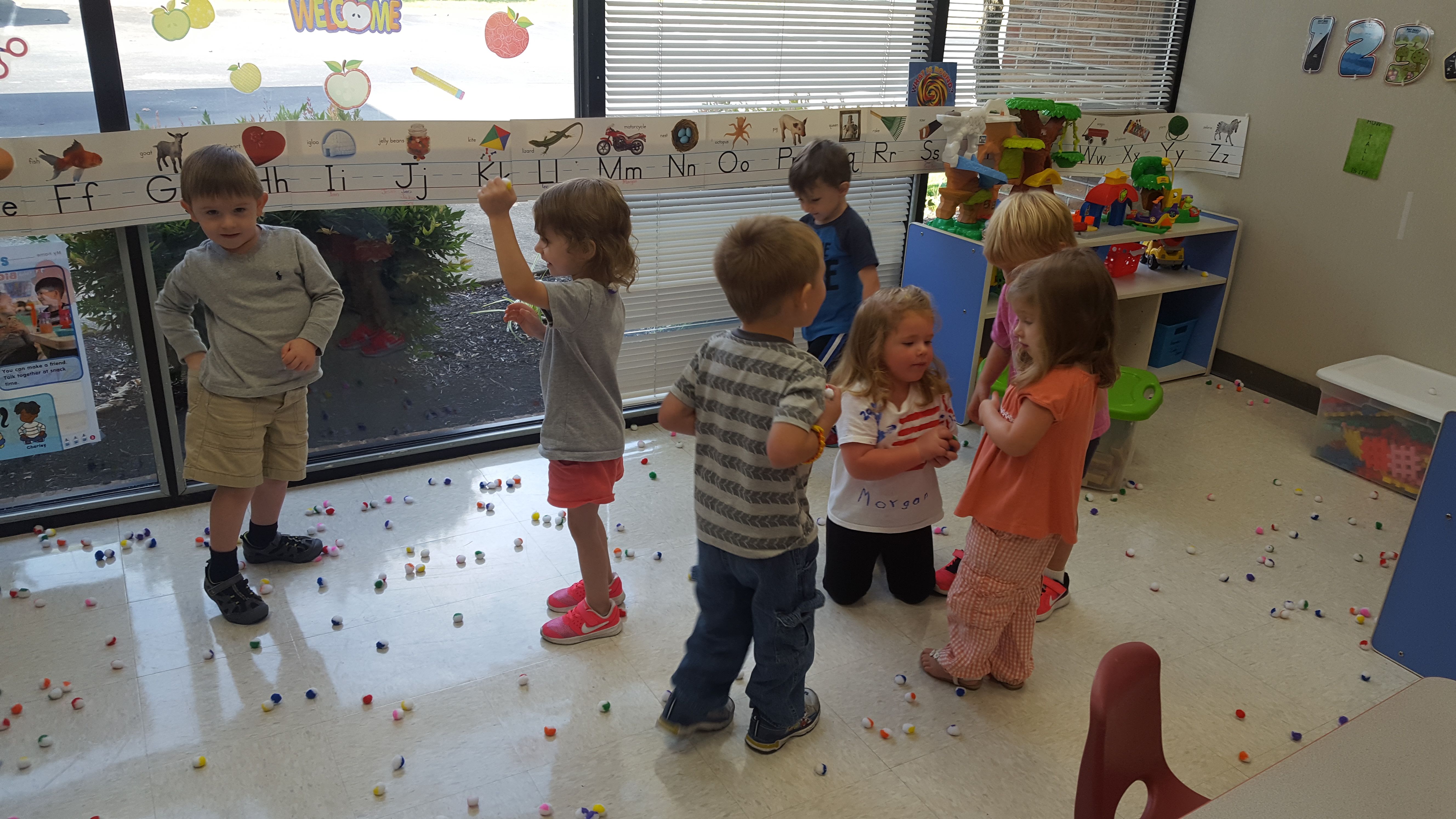 Having a snowball fight out of pom poms