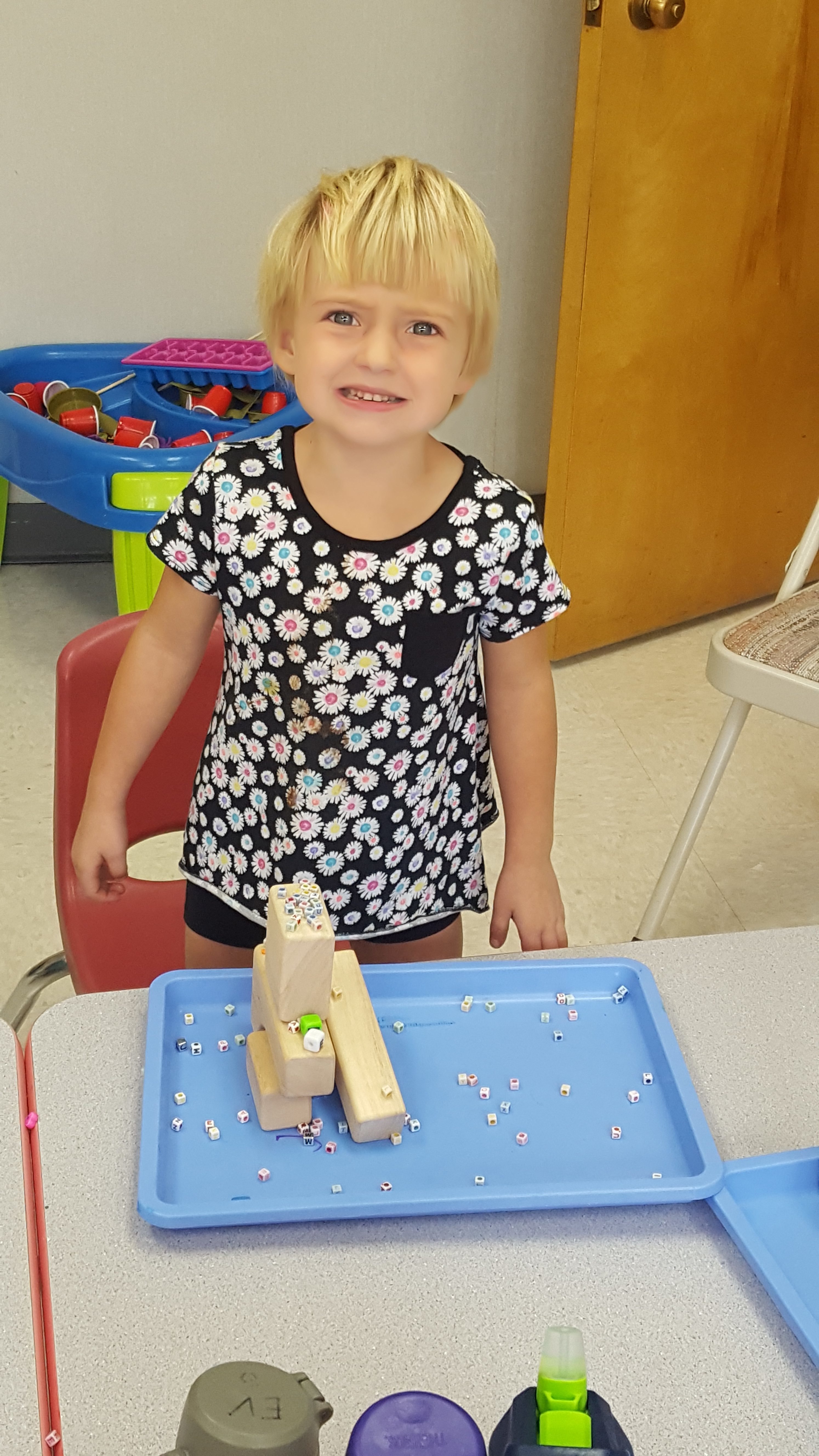 Practicing STEM by using blocks and ABC beads to make a coconut tree from the book Chicka Chicka Boom Boom