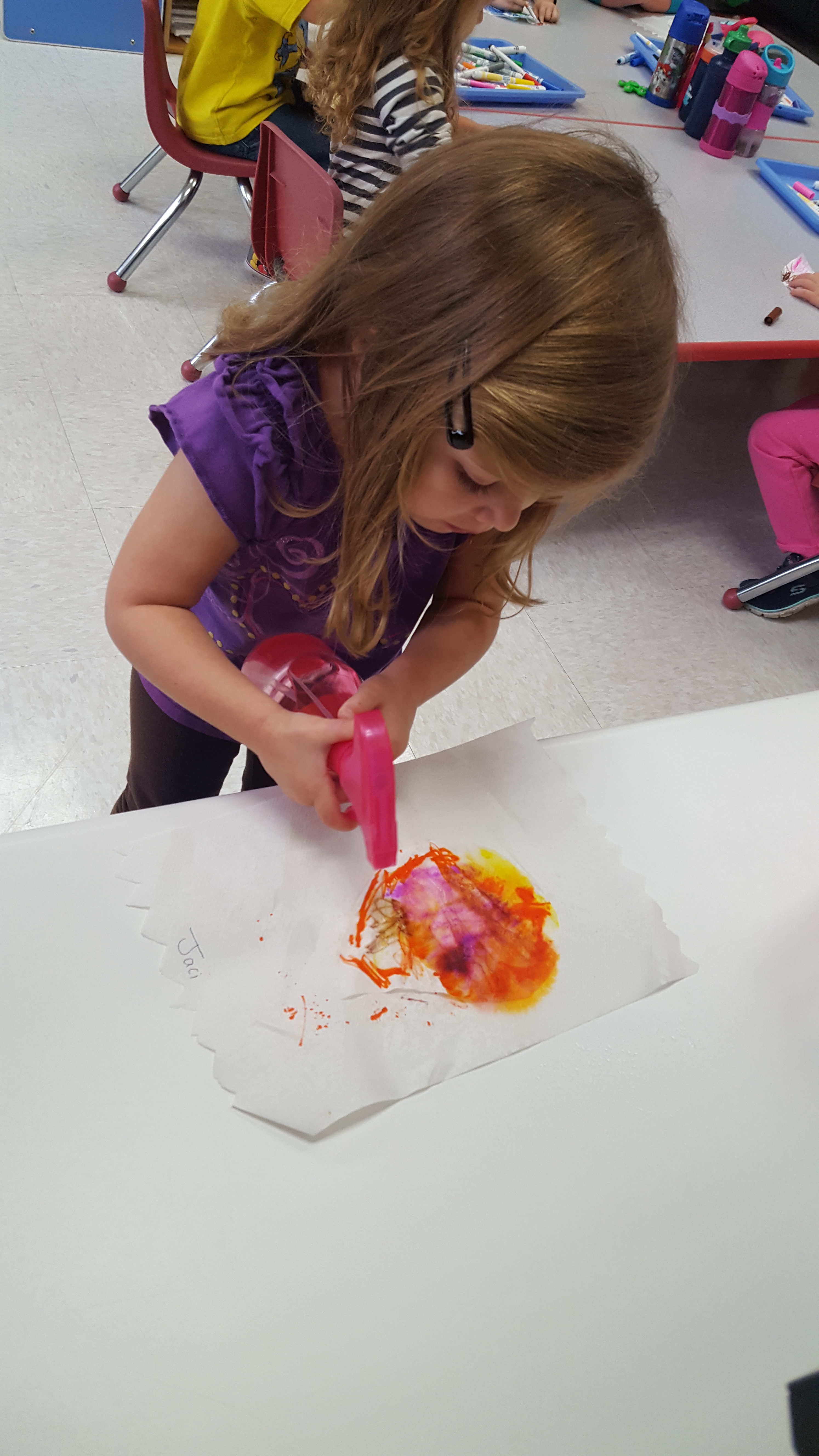 Spraying her leaf with water to tye dye the colors