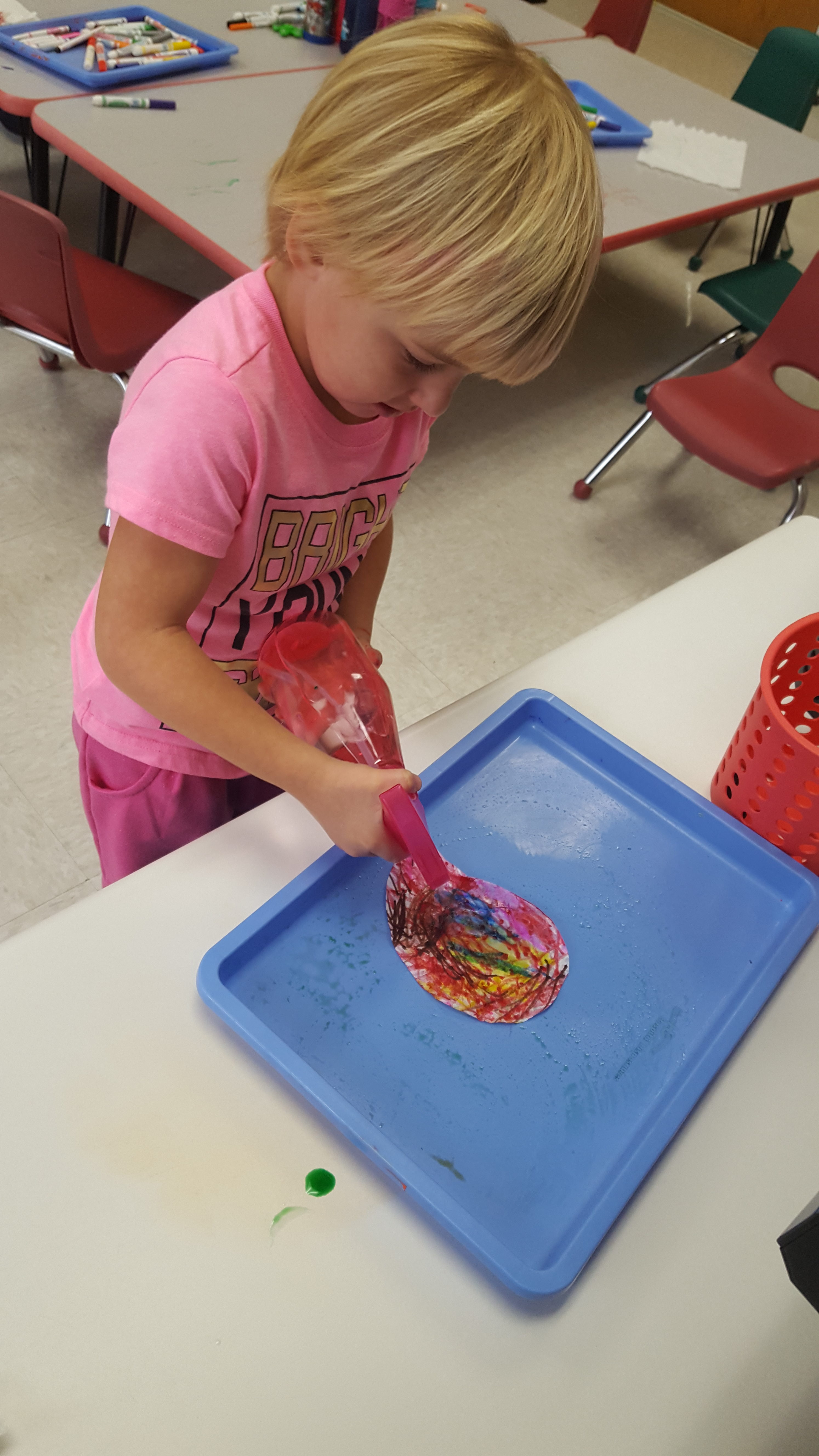 Spraying her leaf with water to tye dye the colors